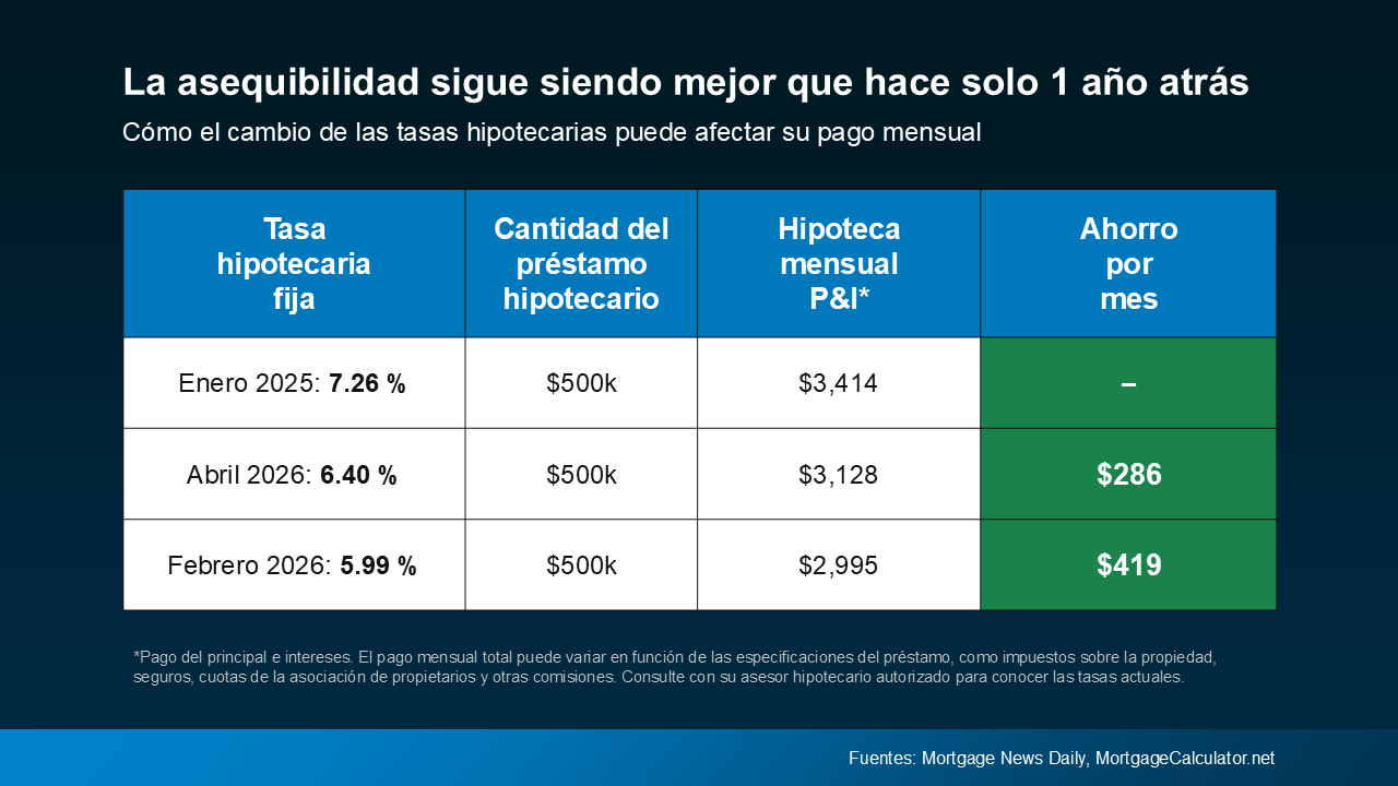 Supongamos que está pidiendo un préstamo de $500,000 dólares. Incluso con las tasas en torno a los 6 y menos altos, sigue ahorrando aproximadamente $300 dólares en su pago mensual en comparación con los compradores que hicieron su compra a principios del año pasado.