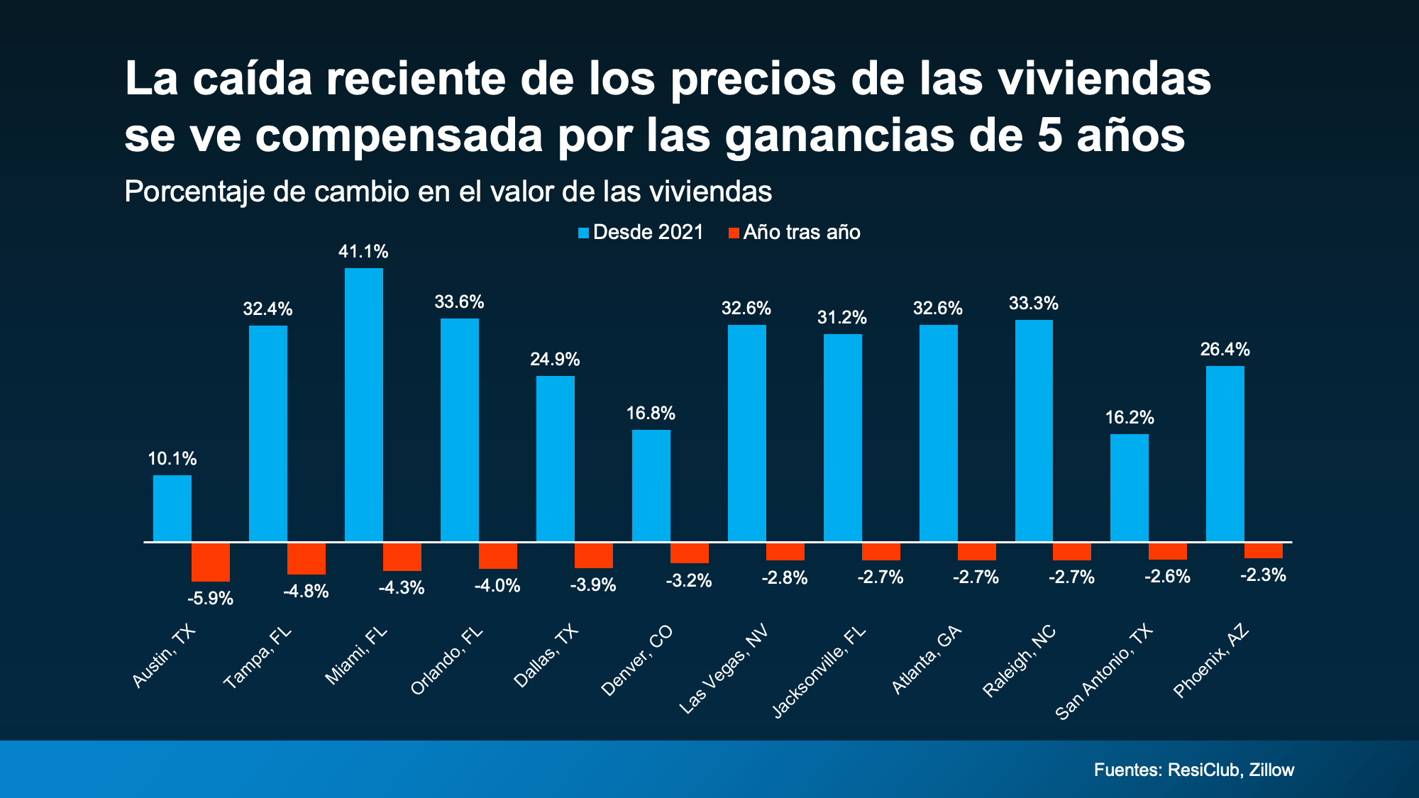 E incluso en los mercados que experimentan ligeras caídas, estas no son suficientes para compensar las grandes ganancias que la mayoría de los propietarios han experimentado en los últimos 5 años (vea la gráfica siguiente):