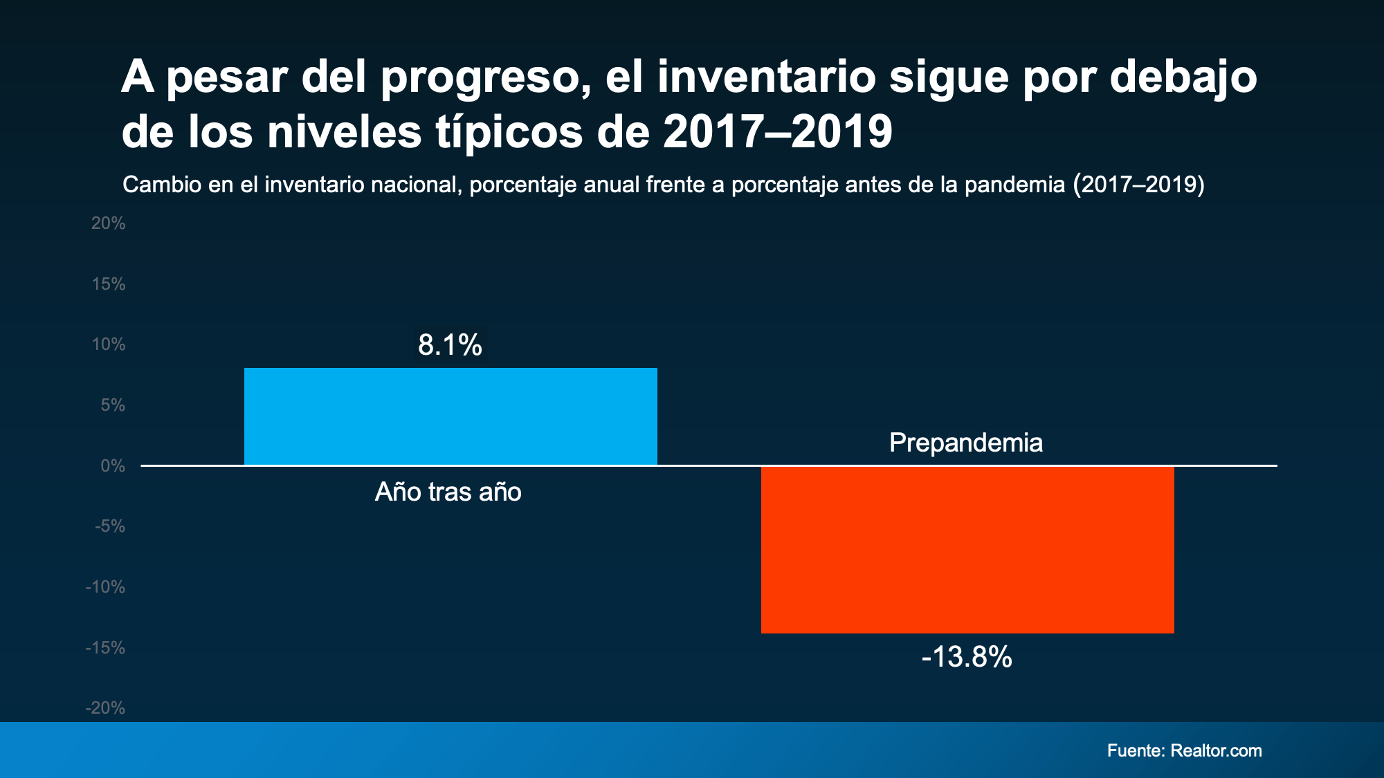 Los datos de Realtor.com demuestran que, aunque el inventario ha subido respecto al año pasado, sigue siendo casi un 14 % inferior al que era durante el último mercado de la vivienda normal (2017-2019):