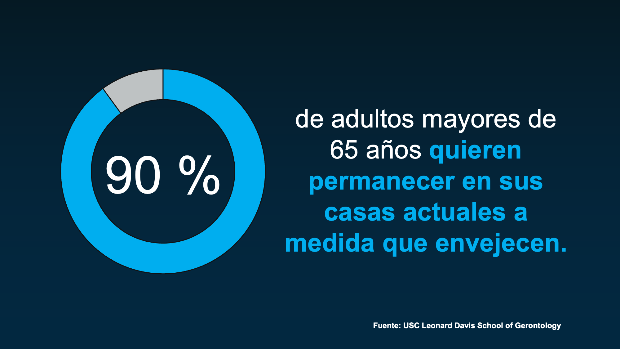La Escuela de Gerontología Leonard Davis de la USC encontró que alrededor del 90 % de los adultos mayores de 65 años quieren permanecer en sus casas a medida que envejecen (vea la siguiente gráfica):