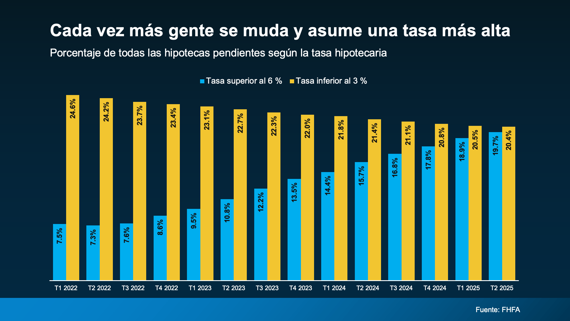 Cada vez más propietarios deciden que vale la pena mudarse, aunque eso signifique renunciar a una hipoteca más baja. La vida no se detiene: la gente consigue nuevos empleos, hace crecer su familia, reduce el tamaño de su casa tras jubilarse o simplemente quiere vivir en otro barrio. Esas necesidades empiezan a superar el beneficio financiero de aferrarse a una tasa hipotecaria muy baja”.